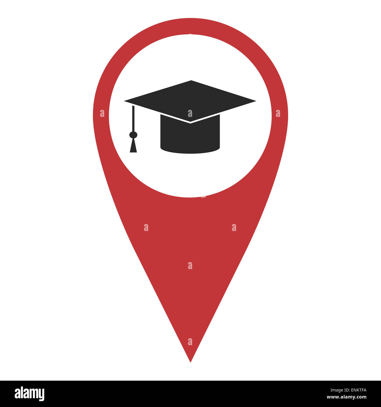 Red geo pin with graduation hat on white. School sign, geolocation
